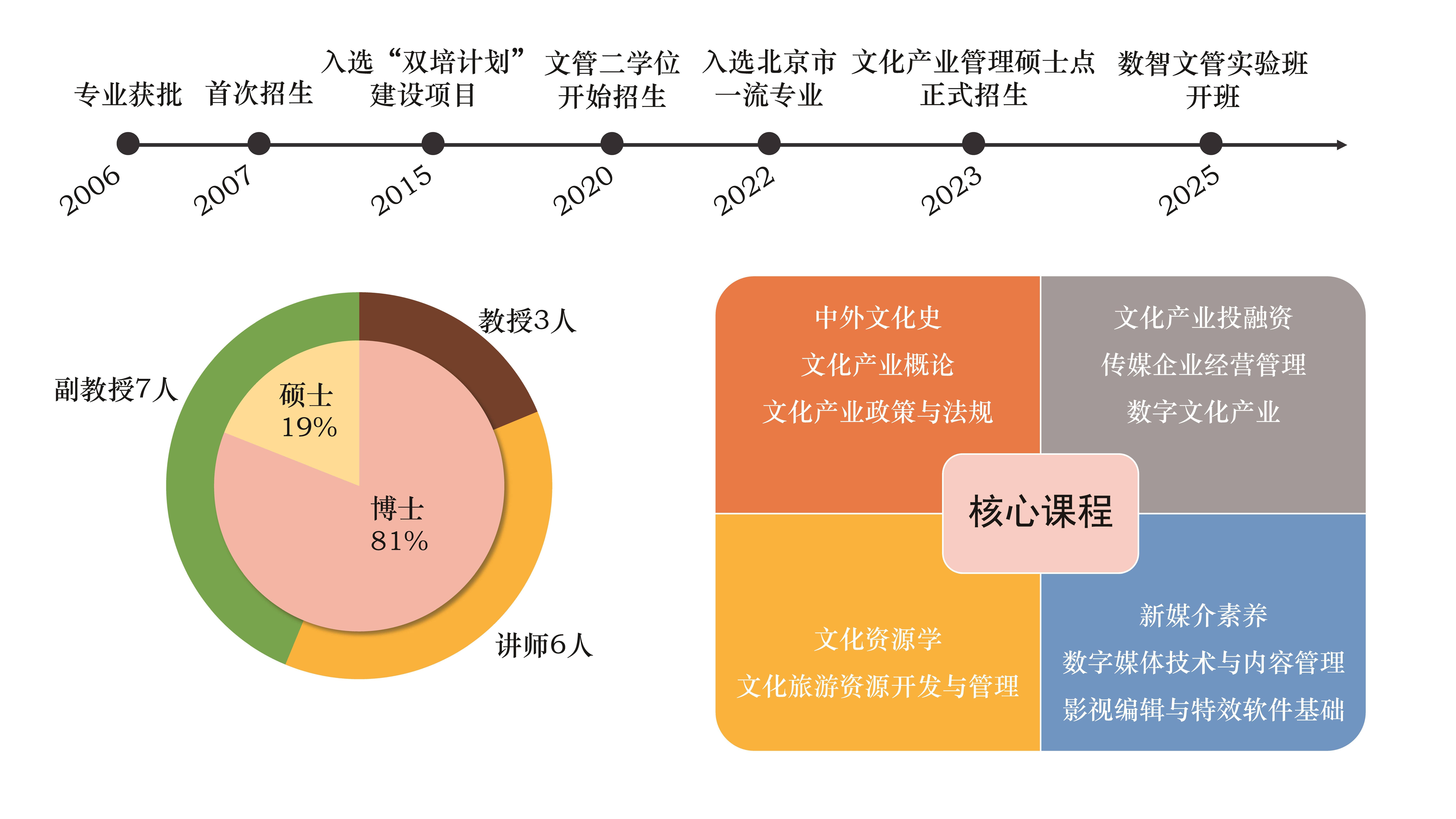本专业面向数字媒体、文化旅游等文化产业领域,为数字文化产业和首都文化建设培养具有经营管理综合能力、富有创新精神和国际视野的高素质复合应用型文化产业管理人才。本专业2007年首次招生,2015年入选由北京市属高校与在京中央高校共建的“双培计划”建设项目。2022年入选北京市一流专业,2023年文化产业管理硕士点正式招生,2025年数智文管实验班开班。