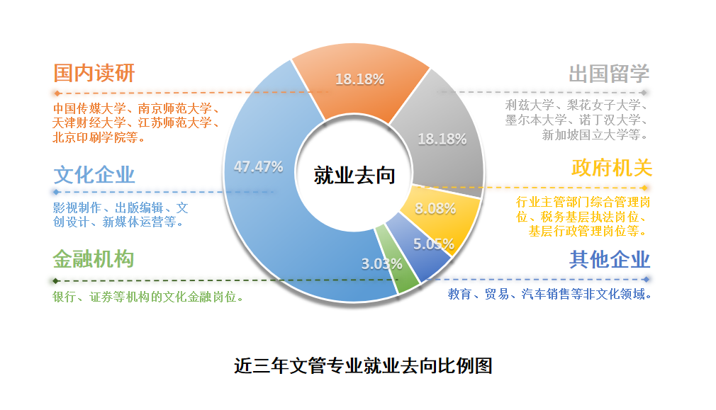 除了读研深造和出国留学外,本专业毕业生的就业去向主要是文化产业领域如新闻出版、影视产业、网络媒体、文化旅游及政府文化管理部门等,从事创意策划、经营管理、投融资、文化贸易与交流等工作。