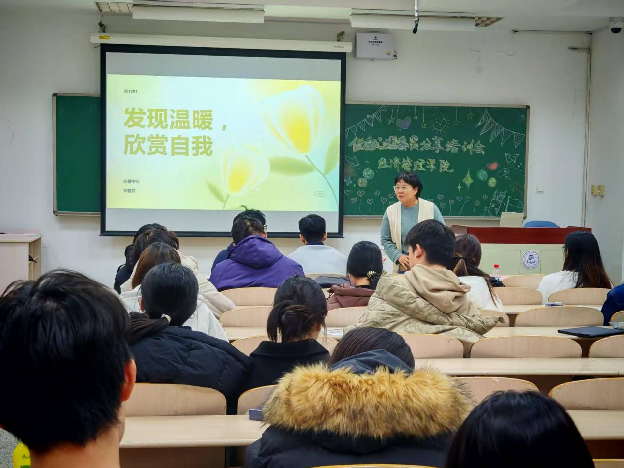 为更好的传播心理健康教育知识,提升心理委员的工作能力,经济管理学院于12月1日在教学楼103举办心理委员培训会。学校心理中心教师刘爱芹,学院辅导员朱羽参加培训会。