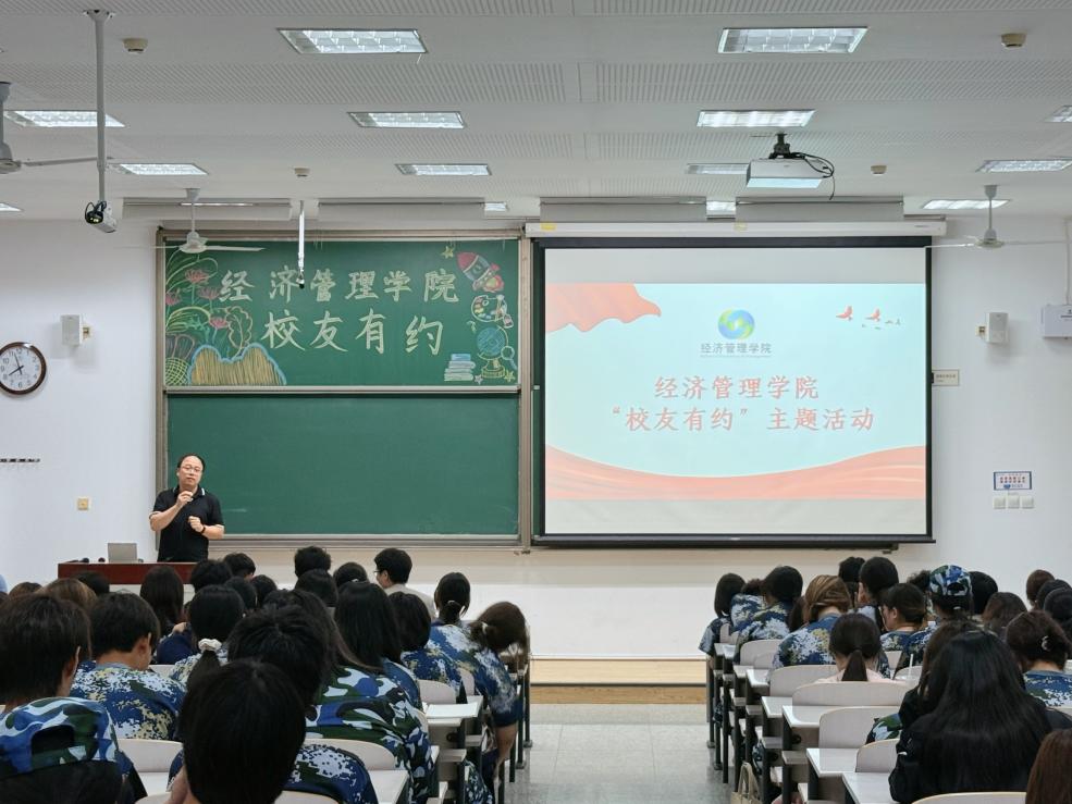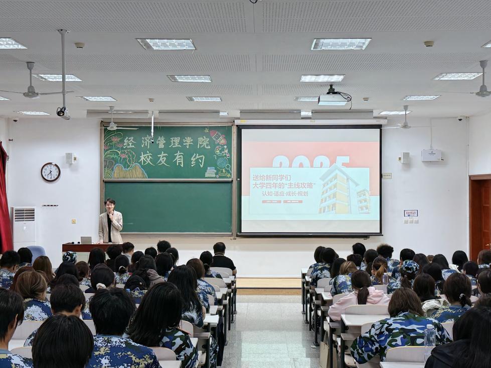 为加强新生入学教育,帮助新生尽快适应大学生活,提前做好职业生涯规划,明确未来发展目标和方向,经济管理学院于9月19日在西校区教学楼505教室举行“校友有约”活动。优秀毕业生张家跃、刘骏颜校友以及2025级全体本科生参加本次活动。活动由党委副书记曹进主持。