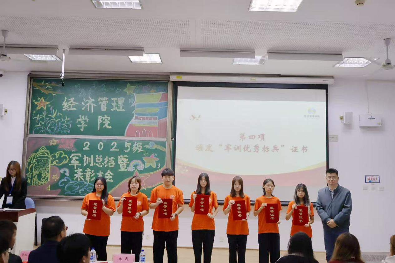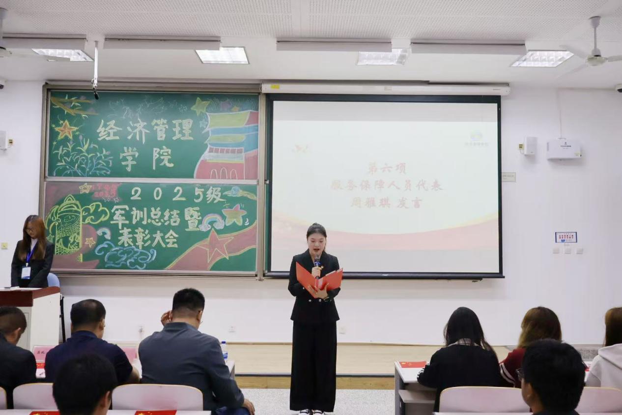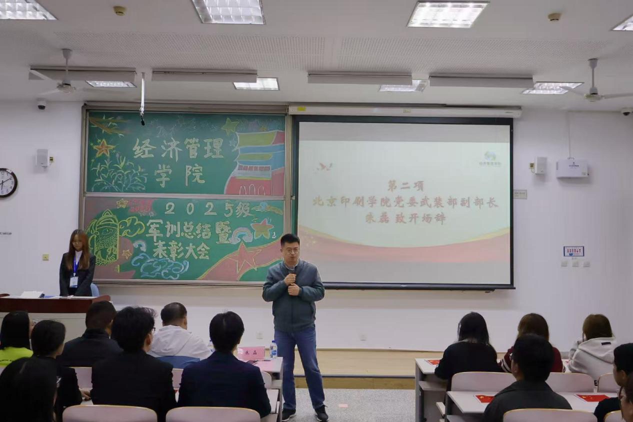 2025年10月10日,经济管理学院在教学楼503举办2025级新生军训表彰大会。北京印刷学院党委武装部副部长朱磊、经济管理学院党委副书记曹进、北京印刷学院党委武装部干事苏比·阿迪力、经济管理学院全体辅导员,以及全体参训的2025级本科生共同参加本次大会。