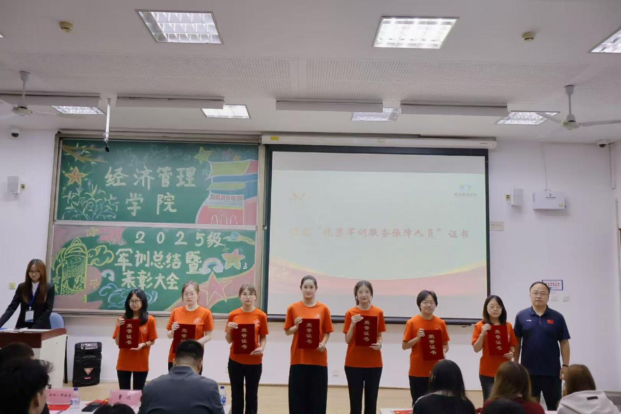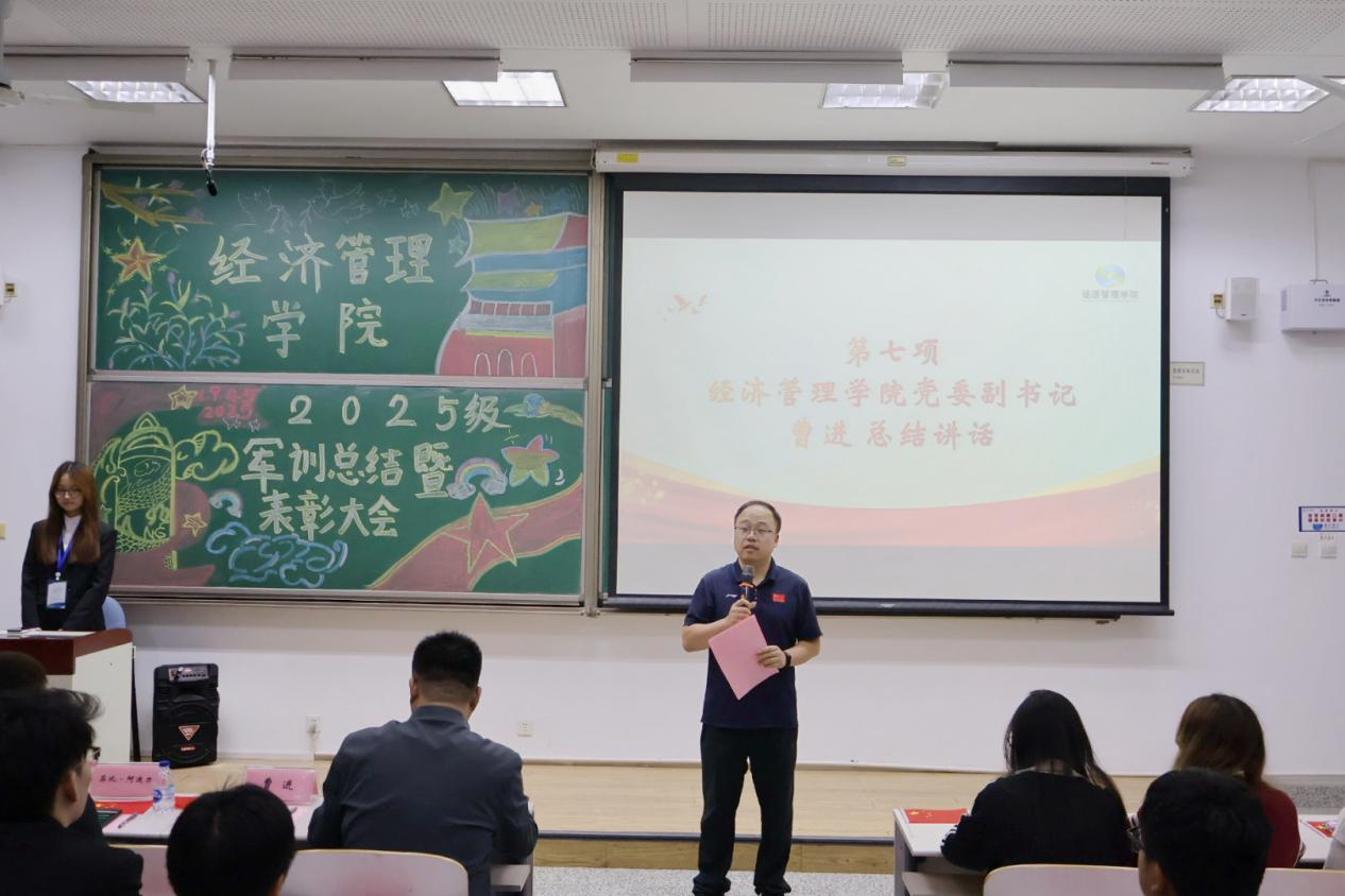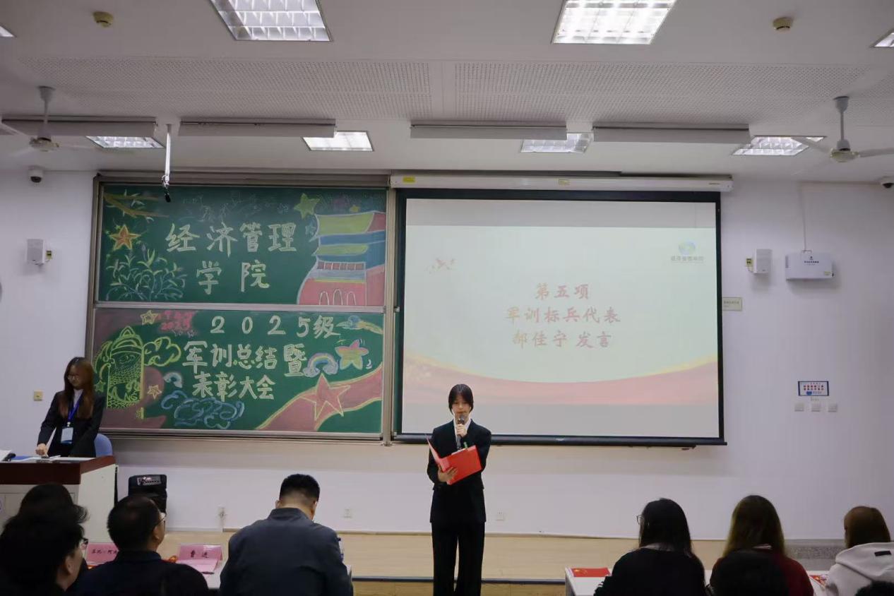 2025年10月10日,经济管理学院在教学楼503举办2025级新生军训表彰大会。北京印刷学院党委武装部副部长朱磊、经济管理学院党委副书记曹进、北京印刷学院党委武装部干事苏比·阿迪力、经济管理学院全体辅导员,以及全体参训的2025级本科生共同参加本次大会。
