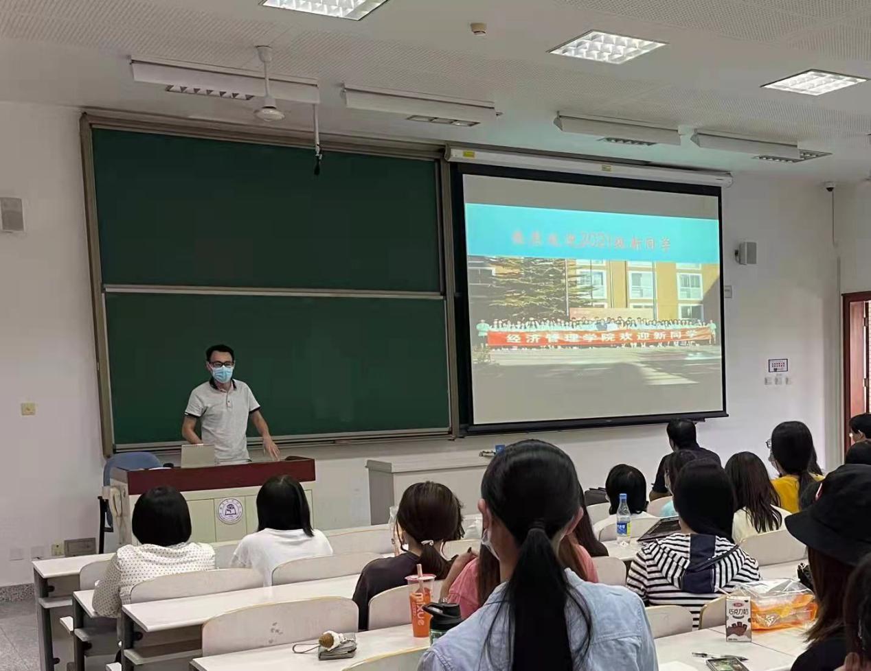 2021年9月15日,经济管理学院举办2021级新生“院长第一课”。大会在教学楼503教室召开,根据疫情防控要求,同学们佩戴口罩入座。经济管理学院院长李治堂、党委书记刘华丽、党委副书记刘硕、副院长刘寿先、副院长王亮、分团委书记张成美以及2021级全体新生共同参加此次活动。