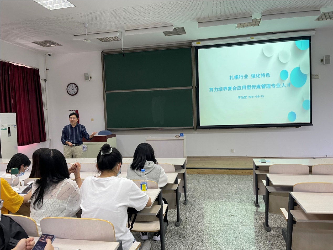 李治堂院长首先代表经管学院全体教职工热烈欢迎2021级新生的到来。李治堂院长就学院基本情况、师资状况、培养定位、特色及成效三个方面向同学们进行详细的介绍。通过这一环节,让初来乍到的同学们对大学生活有了更深刻的了解,帮助新生们对未来的生活与学习做出规划,以最快的速度适应大学生活。他强调:经济管理学院以出版传媒为基础,努力建设国内一流传媒管理学院,注重扎根行业、强化特色,结合建设高水平特色型大学的定位,努力将同学们培养成复合应用型传媒管理专业人才。这不仅仅是经济管理学院的目标,也应当是全体经管人的目标。