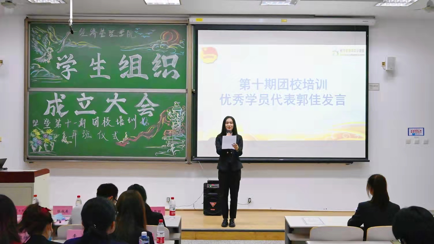 随后,第十期团校培训优秀学员代表郭佳发言。她讲到:在过去的学习中培养了自身在团队工作中的责任感和使命感,强调了在参与中学习、在学习中成长。郭佳同学的演讲深刻展现了“少年强则国强,少年富则国富”的新一代青年昂扬的精神面貌。