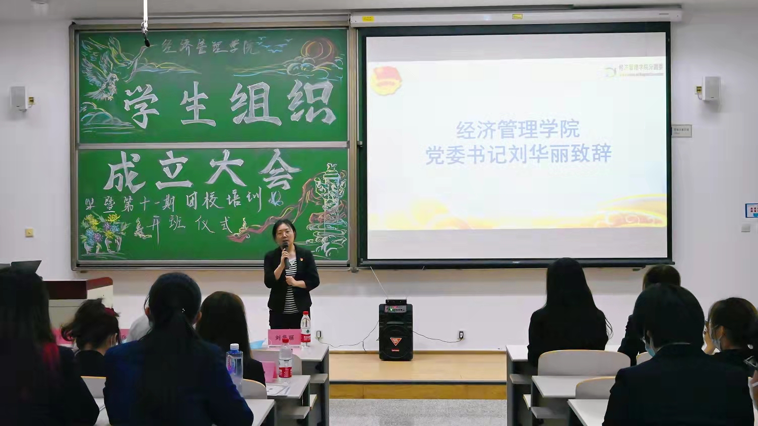 颁发聘书后,经济管理学院党委书记刘华丽向新一届学生组织成员致辞,表达了学院党委对新一届团学组织全体成员的殷切期望,希望在建党百年之际围绕党史学习教育继续带领学生组织成员成长,并提出以下要求:作为新时代的大学生团学骨干,要树立远大理想,自觉将个人融入社会和国家;更要学会珍惜学习机会,在一系列的培训中切实提高个人的综合能力。刘华丽引用习近平总书记的良言:“广大青年要立志做大事,而不是立志做大官”。最后,刘华丽要求广大青年干部自觉遵守团校规章,并送出了对全体青年学生干部的深切关怀和诚挚祝贺。