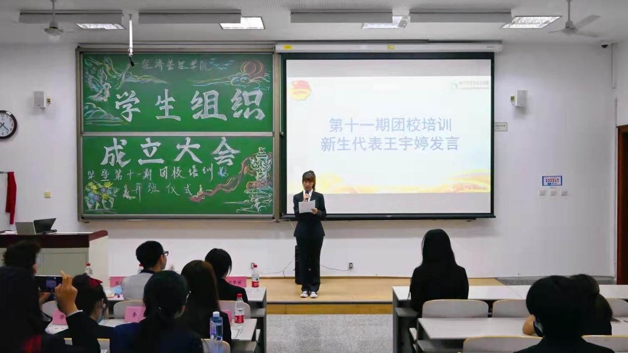第十一期团校培训新生代表王宇婷发言。她描述了对未来的期望和对自身的严格要求,体现了新一代青年面貌。