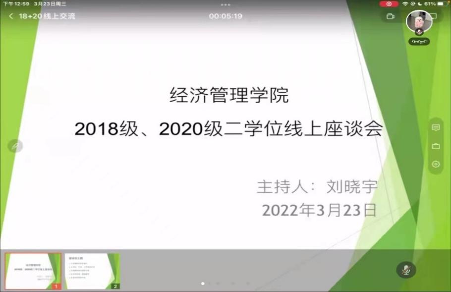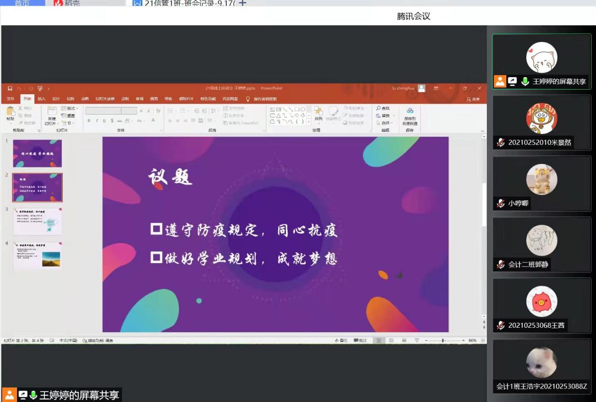 各年级根据学生不同阶段情况,分别以不同主题召开座谈会。18级座谈会主题为“就业领航”,主要围绕疫情防控、思政动态、学业提醒、生活关怀、就业领航、等部分开展。19级以“考研动员”为主题,主要从疫情防控要求及考研动员两个方面进行详细讲解,鼓励文管、营销专业的同学积极参加“挑战杯”大赛,丰富自己的简历。20级主要围绕“安全无小事”,就疫情防控安全问题对各位同学进行了提示,督促同学按时上网课,并为大家进行心理疏导。21级以“同心抗疫 学业领航”为主题,围绕线上课程学习状况、疫情防控安全提示等方面开展深入交流。