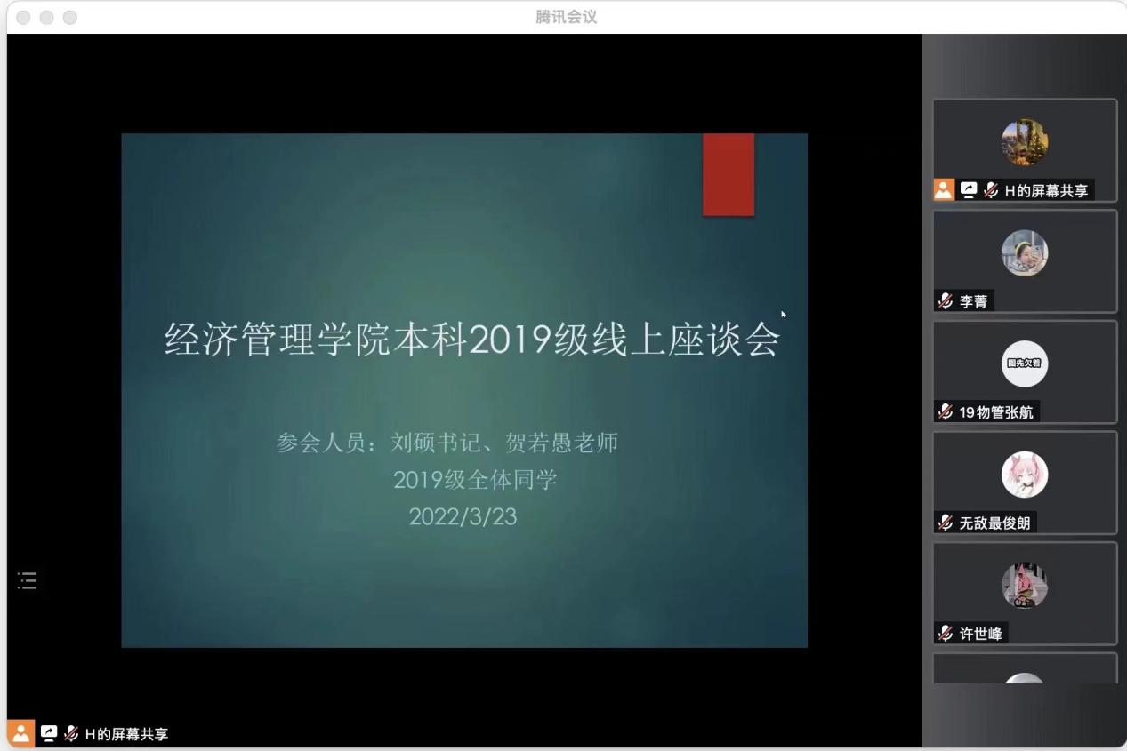 3月23-25日,经济管理学院本科、研究生各年级分别召开了学生线上座谈会。经济管理学院党委副书记刘硕、20级年级主任阿曼古丽、18级年级主任刘晓宇、研究生辅导员王婷婷、21级年级主任张成美、19级年级主任贺若愚分别主持会议,各级学生参加座谈。