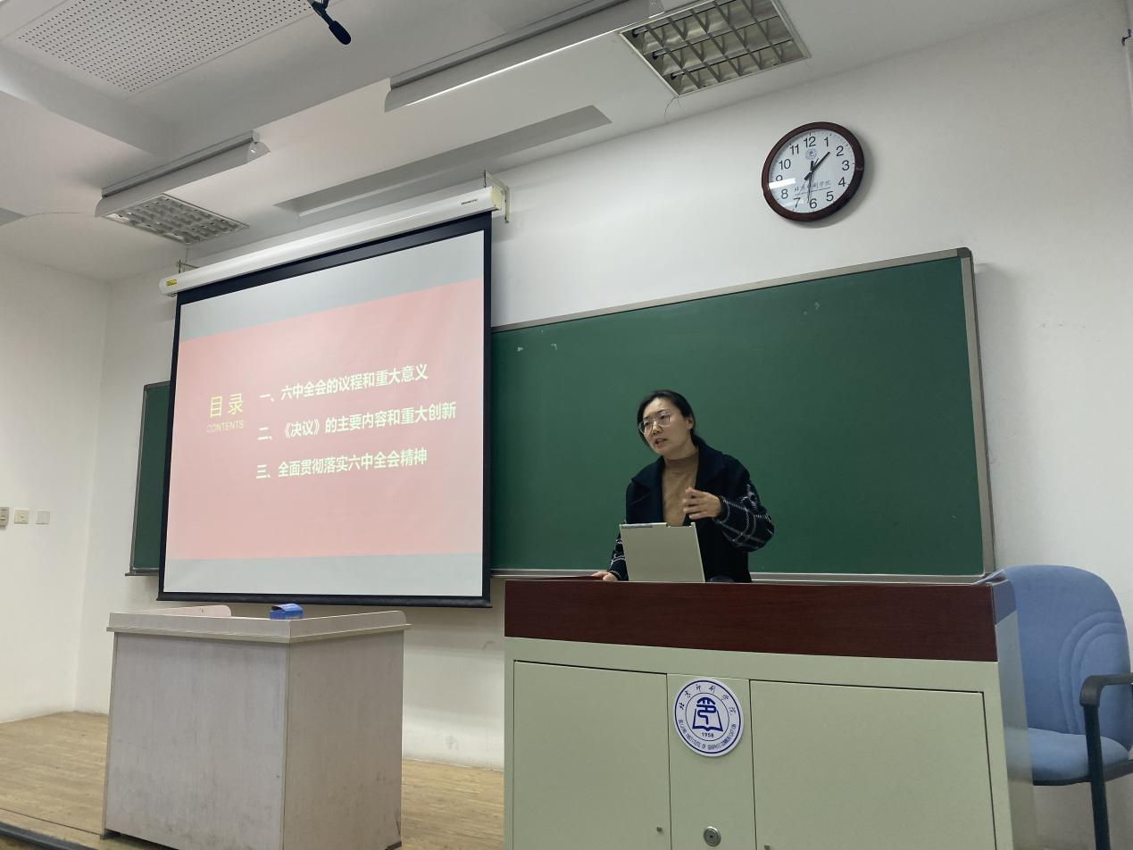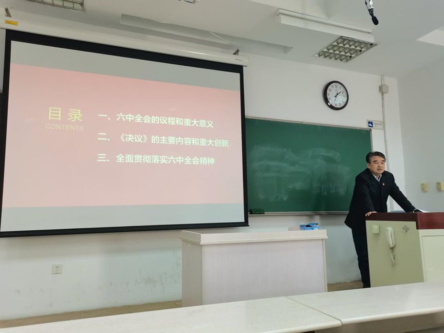 马兴彦结合自身经历向同学们讲授六中全会的议程和重大意义、《决议》的主要内容和重大创新以及如何全面贯彻落实六中全会精神。
