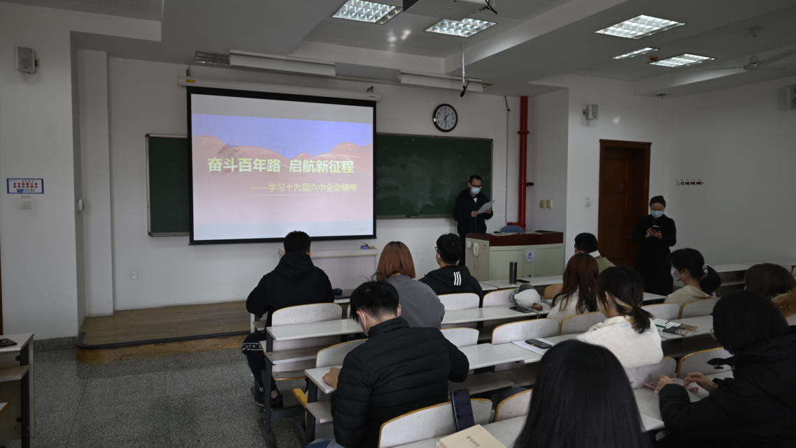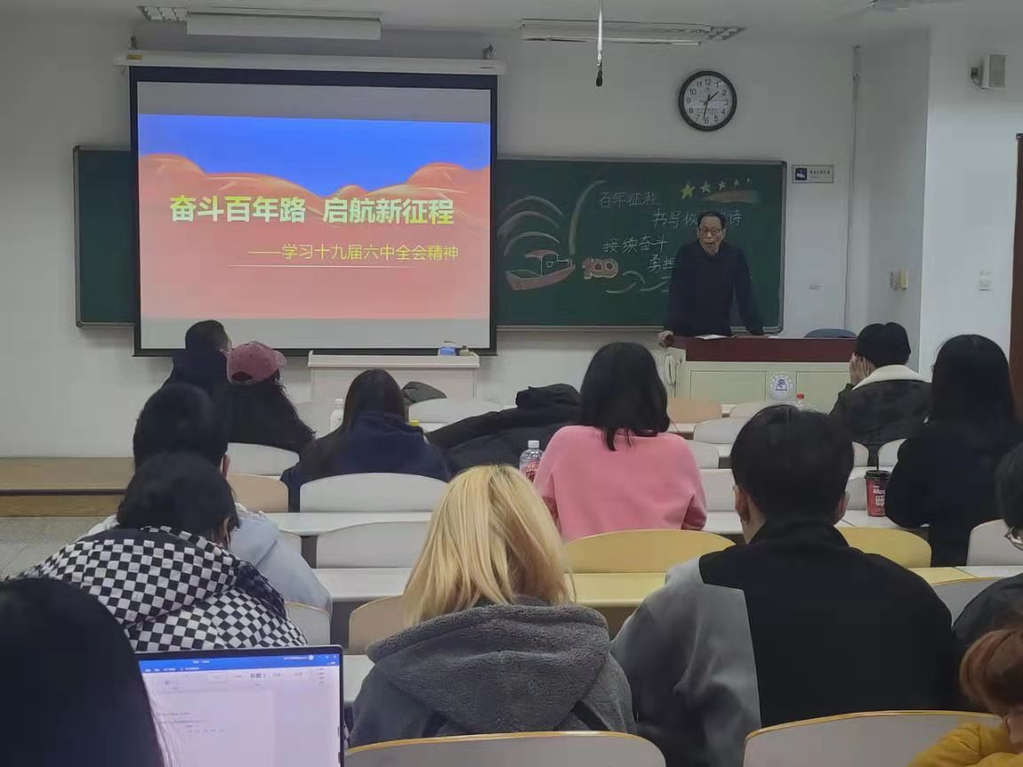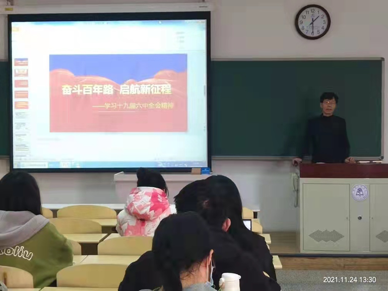 王关义的讲解分为三个部分:六中全会议程和重大决议、《决议》的主要内容和重大创新、全面贯彻落实六中全会精神。老师的讲解生动详细,分别介绍了百年历程中的四大时期、四段任务以及每一时期的历史任务、奋斗历程、主要成就和重大意义,并从百年奋斗的历史意义和宝贵的历史经验联系到学生的自身,对学生提出了建议与希望,叮嘱同学们不要好高骛远,要脚踏实地学好每一门课,做好理论储备,养成好习惯和良好的品格。