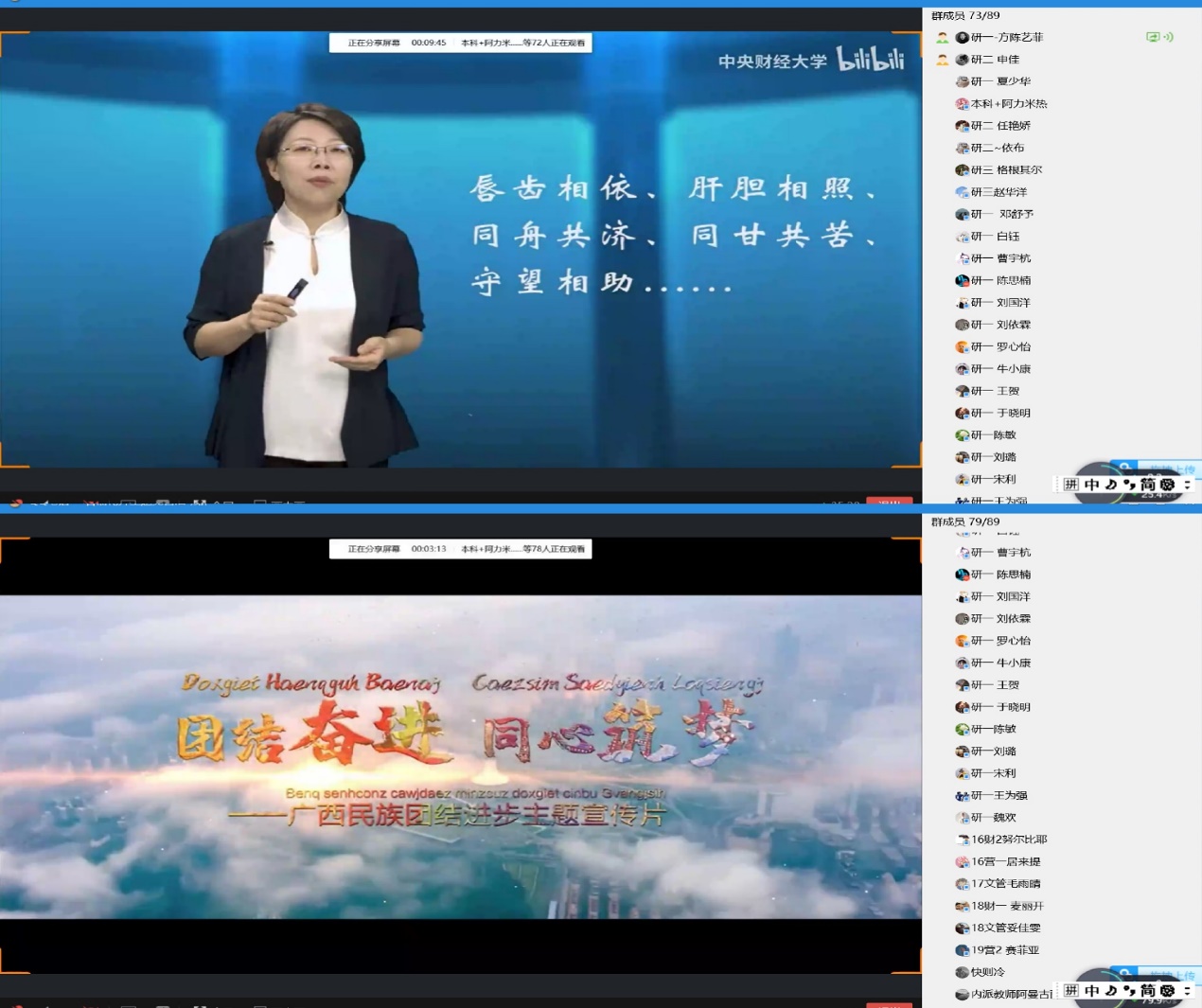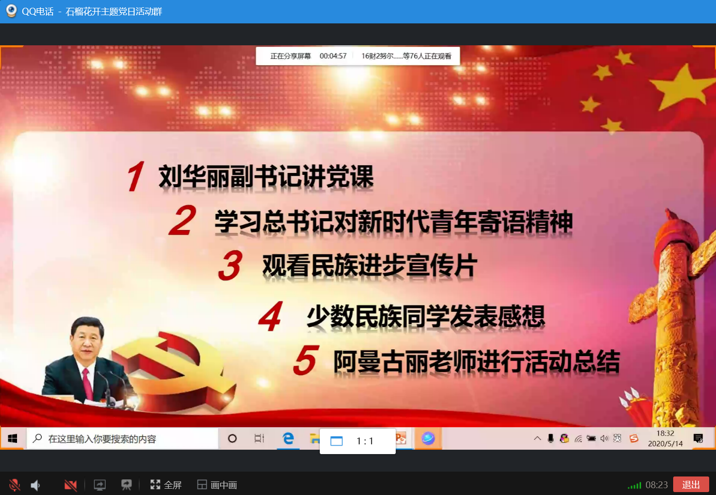 2020年5月14日下午6:30,经管研究生党支部开展“石榴花开-五四精神,传承有我”民族团结系列主题党日活动。经管学院党委副书记刘华丽,学工组阿曼古丽老师,经管研究生党支部全体党员和积极分子、少数民族同学代表参加了此次活动。