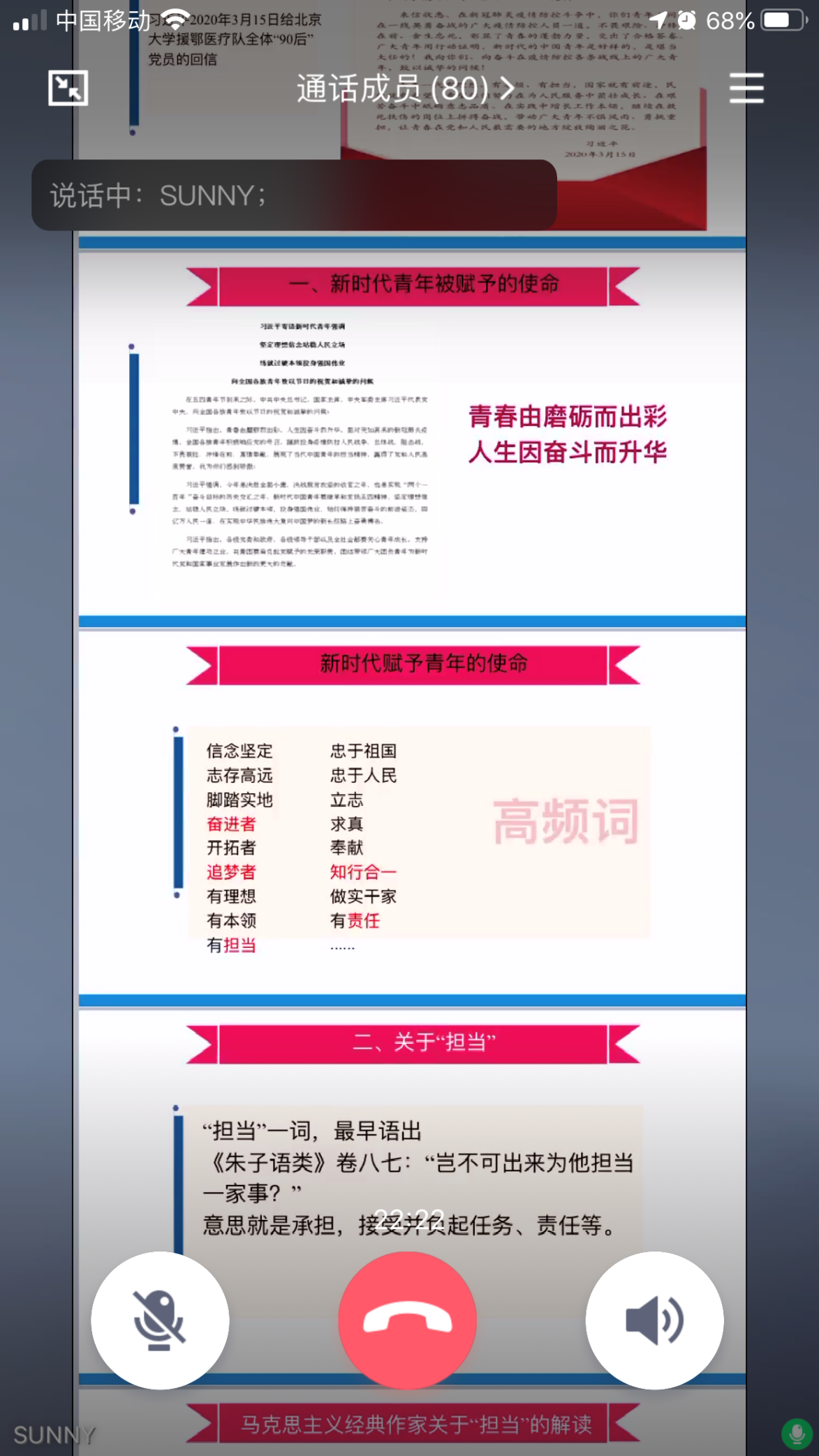 会议进行第四项,少数民族同学代表杨依鸣、洪绍桢、李艺涵、海瑞以及阿丽米热、依卜拉热依木分别发表自己对于传承五四精神的理解,以及疫情下对于民族力量、国家团结的感想。