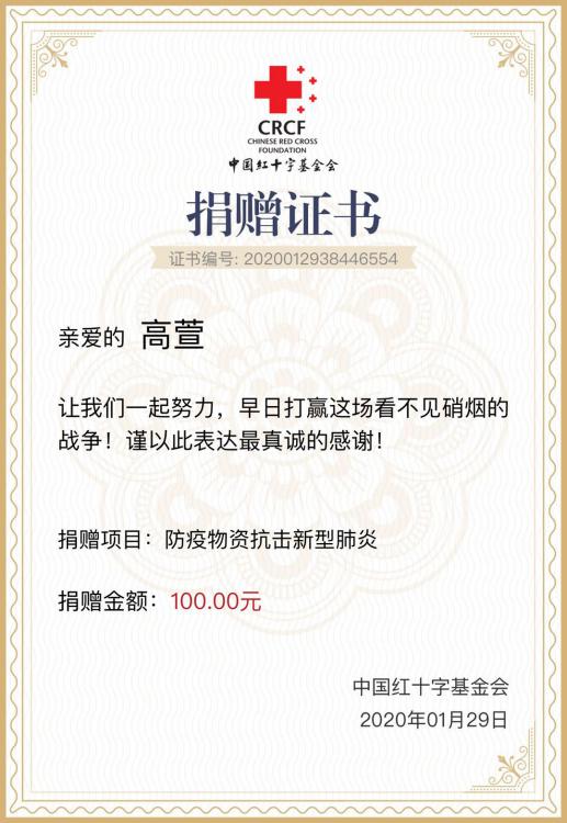 当得知武汉各项物资紧缺后,财管学生党支部的高萱同志在1月29日便为防疫物资抗击新型肺炎进行了捐款,为疫区防控工作献出自己的微薄之力。