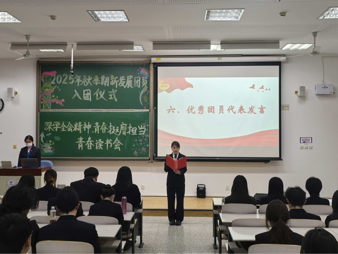 24级文化产业管理三班邢一晗作为2025年秋季学期新发展团员代表发言。她分享了自身对团组织的深刻认识,并表示作为一名新团员,应当主动承担起新时代青年的历史使命,将个人理想融入国家发展的宏伟蓝图,坚定不移跟党走,锤炼过硬本领,甘于奉献,为民族复兴的伟大事业贡献青春力量。