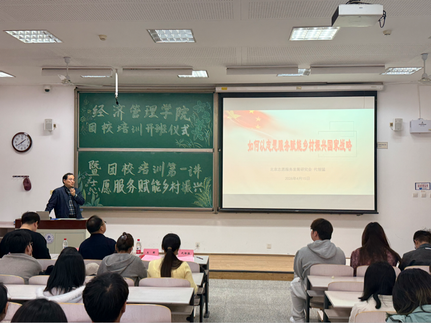 为夯实基层团组织建设,提升学生骨干的履职能力,经济管理学院于4月15日在教学楼503教室举办经济管理学院团校培训开班式暨团校培训第一讲。邀请北京志愿服务发展研究会副会长代恒猛授课。校团委书记王昕、经济管理学院党委副书记曹进、分团委书记戢泽羽,学生组织全体成员、各年级团干部参加本次培训。