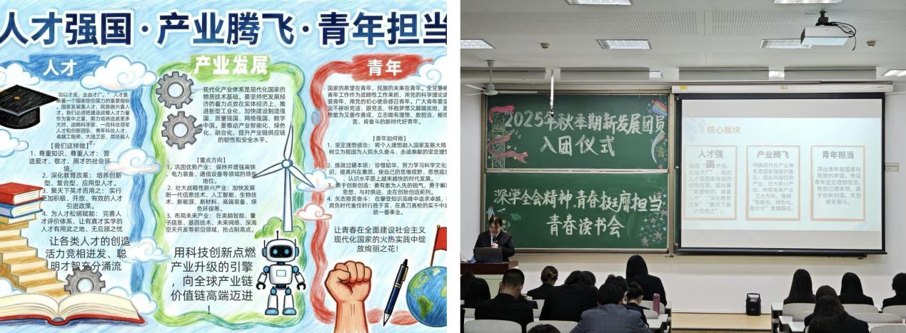 活动以视频导读的形式开始。随后各小组围绕党的二十届四中全会精神展开了深入学习。新发展团员周玥婷以“人才强国·产业腾飞·青年担当”为主题,通过手抄报图文结合的方式分享学习心得。